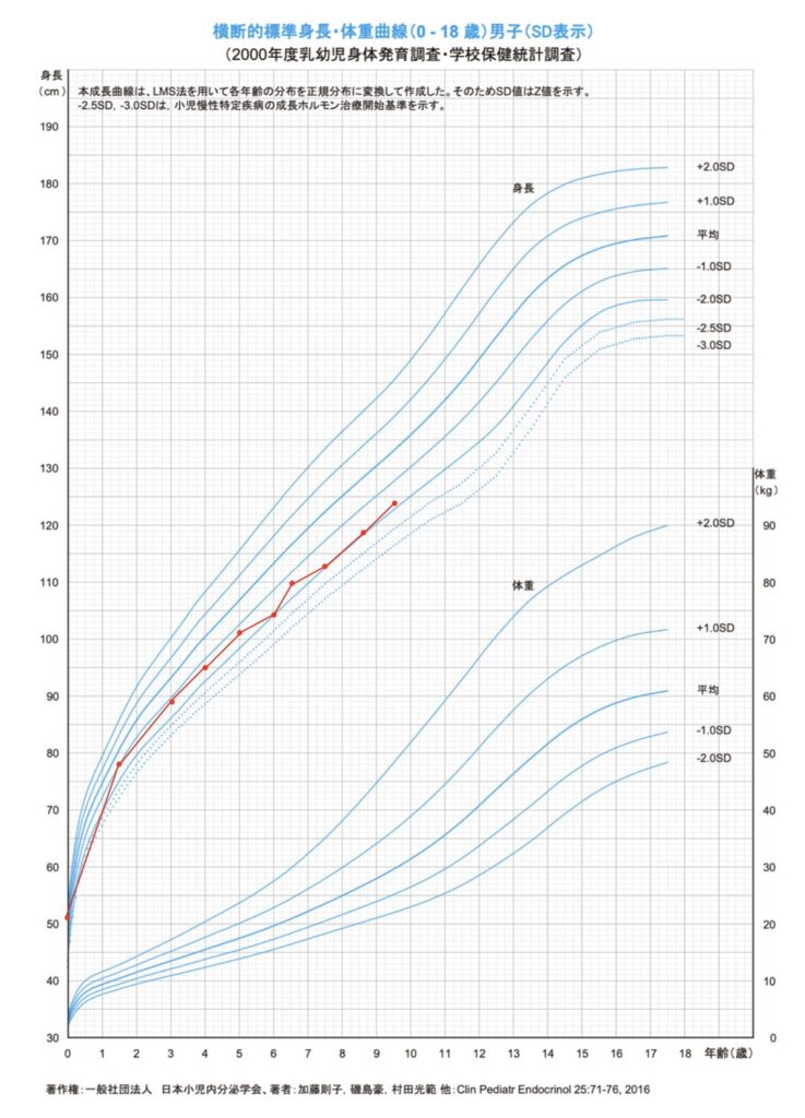 健康診断の身長を身長曲線にプロットすると、ずっと −2SDライン(下限) をまま推移していることに気づいたのです。